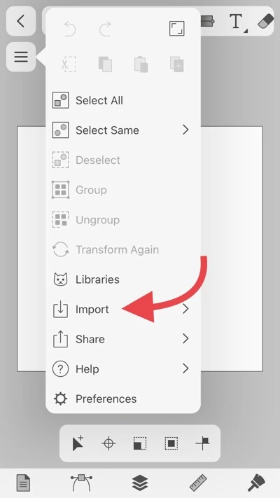 ダウンロードした家の図を下絵として読み込むため、メニューから「Import」をタップします。