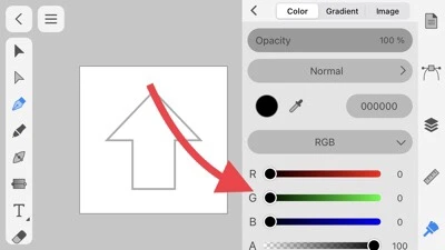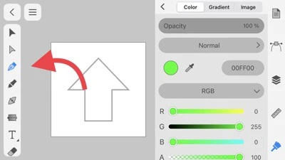カラーパネルのうち、Gのスライダーを右端までスライドさせて、ペンの色を緑色にします。