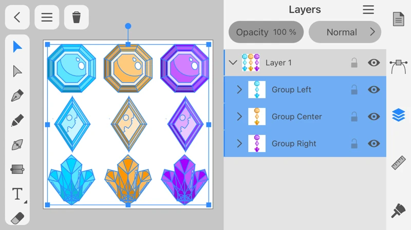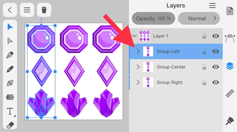 この図では、グループ化された宝石のうち、左のグループを選択します。