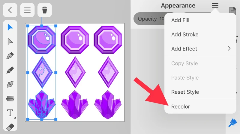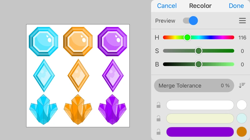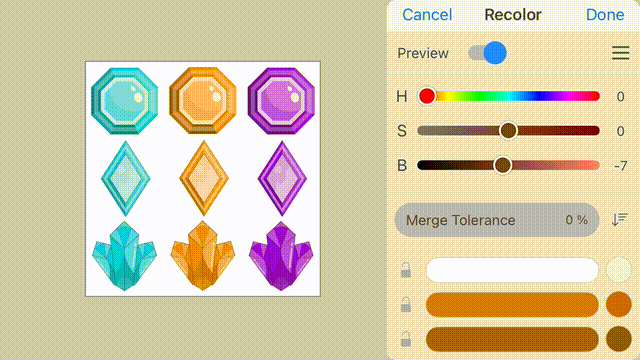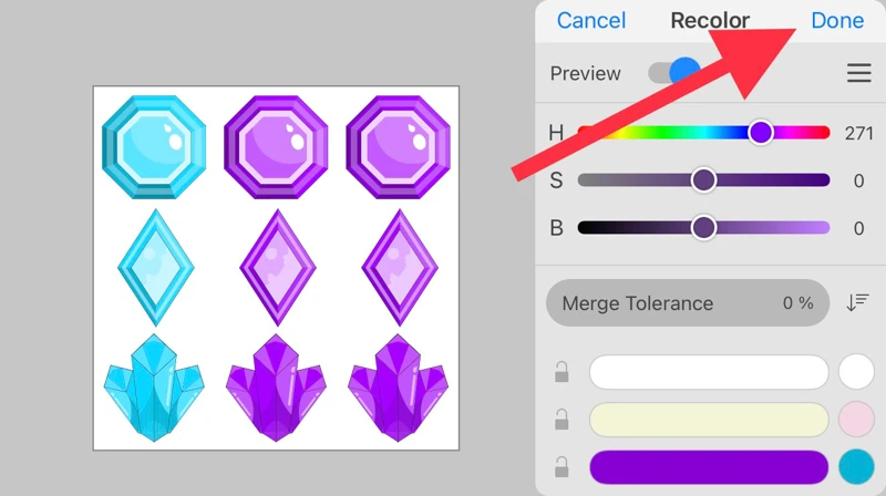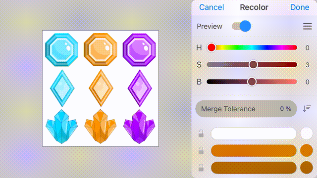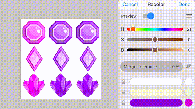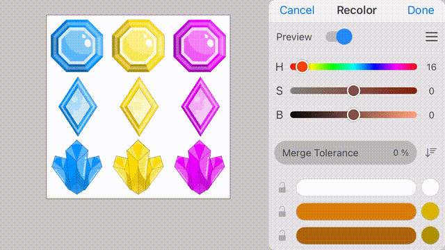 もしRecolor機能がないと、宝石を一つずつ選択して、色を変更する必要があります。