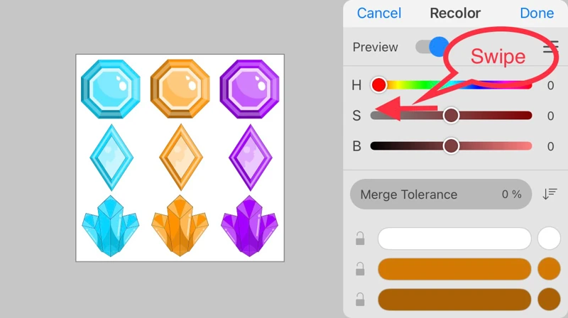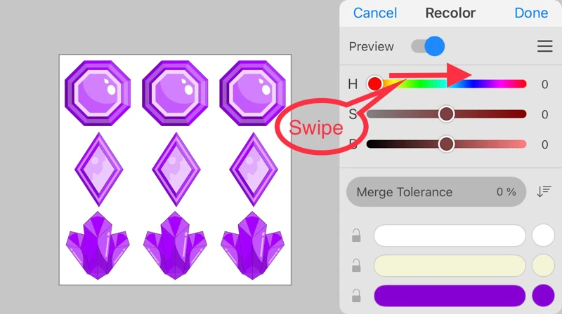 Hのスライダーをスワイプすると、すべての色が変化します。